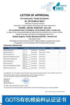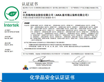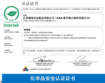 我們獲得了ISO14001環(huán)境認證和ISO9002質量認證,在采購原料及分析階段已事先識別了導致不良的因素,從染料合成階段的工藝分析到商品化加工,最終產品確認,我們全程實行標準化操作,使錦雞的產品在世界任何角落都能滿足客戶的要求。