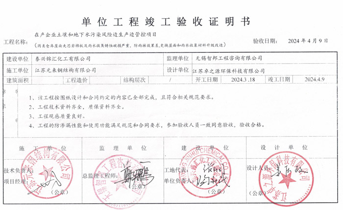 泰興錦匯化工有限公司在產(chǎn)企業(yè)土壤和地下水污染風(fēng)險(xiǎn)邊生產(chǎn)邊管控項(xiàng)目開(kāi)工報(bào)告等資料(丙類(lèi)倉(cāng)庫(kù)屋面夾芯巖棉板及雨水收集銹蝕破損嚴(yán)重,防雨淋效果差,更換屋面和雨水收集材料升級(jí)改造)四方驗(yàn)收證明書(shū).