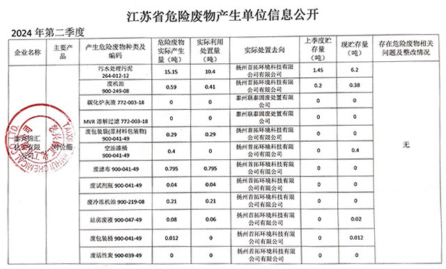 泰興錦匯化工有限公司2024年第2季度危險(xiǎn)廢物產(chǎn)生單位信息公開