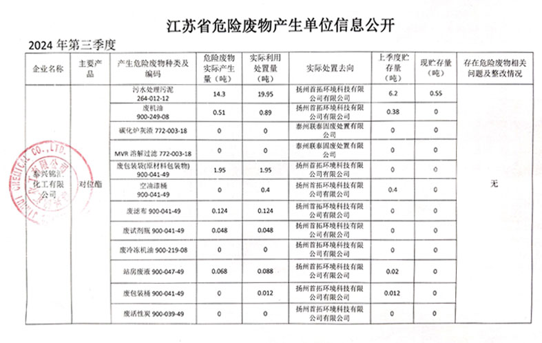 泰興錦匯化工有限公司2024年第3季度危險(xiǎn)廢物產(chǎn)生單位信息公開(kāi)